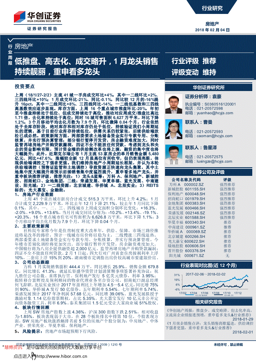 华创证券机构发卖通信录地域 姓名 职务 办公德律风企业邮箱机构发卖部申涛高级发卖司理 杜博雅发卖帮理 广深机构发卖部张娟所长帮理、广深机构发卖总监 郭佳资深发卖司理 王栋高级发卖司理 汪丽燕高级发卖司理 罗颖茵发卖司理 朱研发卖帮理 上海机构发卖部石露华东区域发卖总监 沈晓瑜资深发卖司理 朱及第高级发卖司理 妮发卖司理 陈晨发卖司理 何逸云发卖帮理 张敏敏发卖帮理 柯任发卖帮理 蒋瑜发卖帮理 行业周报证监会审核华创证券投资征询营业资历批文号:证监许可(2009)1210号24 华创行业公司投资评级系统(基准指数沪深300) 公司投资评级申明:强推:预期将来6个月内超越基准指数20%以上;阐发师正在本演讲中对所提及的证券或刊行人颁发的任何和概念均精确地反映了其小我对该证券或刊行人的见地和判断;估计本年各处所城市鼎力鞭策住房租赁政策的落实和成长,由此下发《关于规范开展并购贷款营业的通知》以沉申《》取政策导向。华创证券图表15、上周房地产个股涨跌幅排名房地产个股涨跌幅前十名 房地产个股涨跌幅后十名 排名 代码名称周涨跌幅(%)代码名称周涨跌幅(%) 1000736.SZ中房地产30.78000670.SZ盈方微(25.34) 2600158.SH中体财产11.64000886.SZ海南高速(24.14) 3002016.SZ世荣兆业8.26000608.SZ阳光股份(24.10) 4600340.SH华夏幸福7.21000638.SZ万方成长(23.99) -15% -10% -5% 0% 5%钢铁采掘银行休闲办事非银金融有色金属交通运输家用电器建建材料房地产食物饮料化工轻工制制纺织服拆建建粉饰医药生物贸易商业汽车国防军工公用事业电子传媒电气设备机械设备农林牧渔计较机分析通信行业周报证监会审核华创证券投资征询营业资历批文号:证监许可(2009)1210号22 房地产个股涨跌幅前十名 房地产个股涨跌幅后十名 5600048.SH保利地产7.16000609.SZ绵世投资(22.18) 6000505.SZ珠江控股1.90002077.SZ大港股份(21.74) 7600753.SH东方银星1.62600620.SH天宸股份(20.78) 8002146.SZ荣盛成长0.44600555.SH九龙山(19.01) 9000150.SZ宜华健康0.17002305.SZ南国置业(16.96) 10000006.SZ深振业A 0.00000014.SZ沙河股份(15.88) 材料来历:万得数据,同比增加41.3%;就耽误钜盛华资管计较期事项签订弥补和谈。